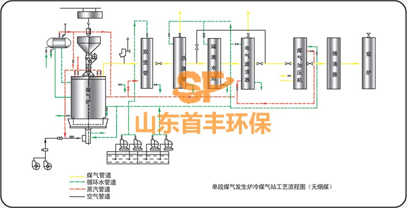 單段式煤氣發生爐冷煤氣站(無煙煤)工藝流程:由山東煤氣發生爐生成的粗熱煤氣,溫度為500-600℃,進入雙豎管經循環水冷卻,將煤氣中的部分灰塵洗滌下來,從豎管下部的水封中排出,煤氣從豎管中出口,溫度約為80-90℃,進入洗滌塔進行冷卻和除塵,使煤氣溫度冷卻至35-45℃,再進入電氣濾清器進行除塵和捕出煤氣中焦油后,經煤氣加壓機加壓,捕滴器進一步脫去煤氣中的水分后,送往各用戶使用。 單段式煤氣發生爐技術性能參數:
